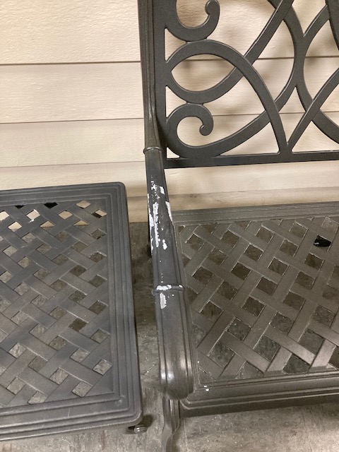 Condition: Most of the pieces are in very good condition, but one of the benches and the chair both have white spots that apparently developed during and after the manufacturing process. It does appear that a person who’s handy (or interested in the process) can fix the problem – I would have tried black spray paint, but it may take a bit more than that, according to this article from Products Finishing: https://www.pfonline.com/articles/addressing-white-spots-on-black-anodized-parts