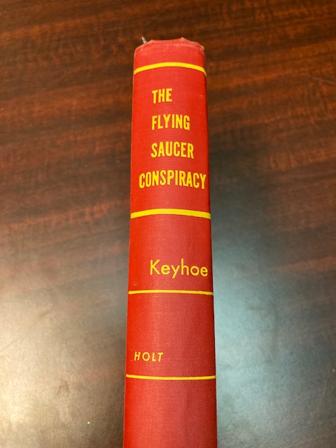 “In 1953, when Major Donald E. Keyhoe wrote Flying saucers from outer space, he hoped that the government’s information on mysterious flying objects would soon be made public. Instead, by a curious reversal of policy, official secrecy was increased. How this secrecy is enforced — the methods by which startling new developments are concealed — is the subject of The flying saucer conspiracy. Since 1953, saucer reports have multiplied; thousands of sightings have been confirmed by veteran pilots, radarman, and trained ground observers. Government investigation has been intensified; prominent engineers and scientists have been brought in to help Air Force Intelligence evaluate the indisputable facts. Yet the Air Force has refused to release a single official report concerning flying-saucer encounters. Major Keyhoe believes that this policy of censorship is sponsored by only a few individuals: men whose motive is to protect the public from possible hysteria. But he finds this censorship inimical to the democratic way of life: man has a chance to act wisely only if informed of all the facts”