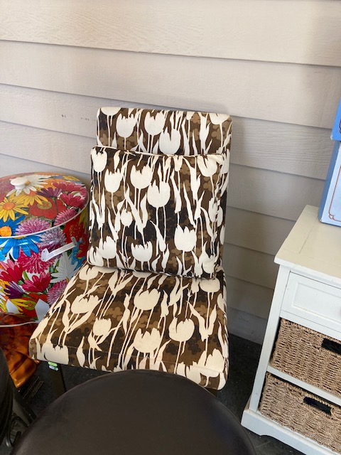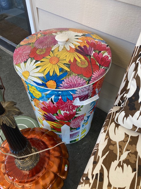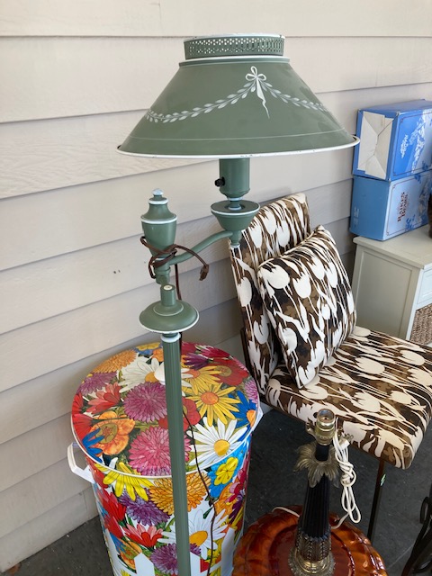 The two amber globes on the left are quite large table lamps with brass bases. The floral item in the back is actually a full-sized trash can (I’d use it to store dog food or bird seed, rather than for trash)! There’s actually another of the black & white chairs, but I didn’t have room in the Jeep to bring it back (and couldn’t load the white wooden rocking chair with faces carved into the arms, either!).