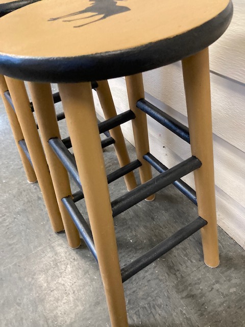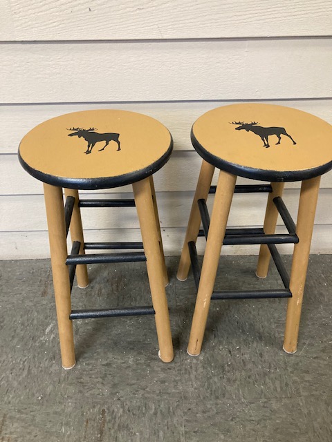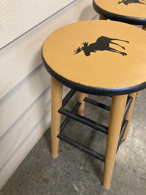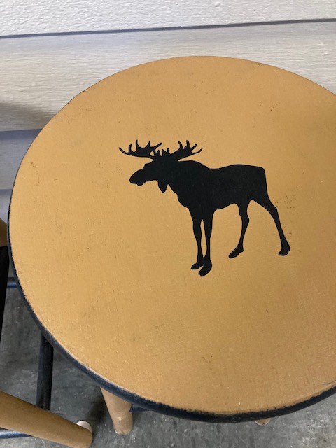 This is a classic pair of wooden stools with a moose stenciled into each. I don’t know if it’s original with the stools or was done after-market. But they’re adorable, either way!