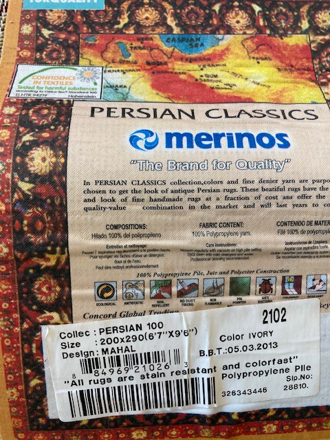 Condition: Appears to be in perfect condition; I found no spots or stains on the front – or on the back, which is where they normally show. The rug appears to be practically brand new.