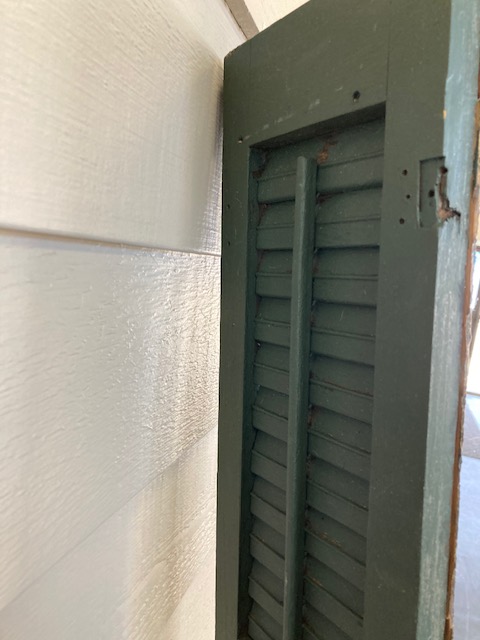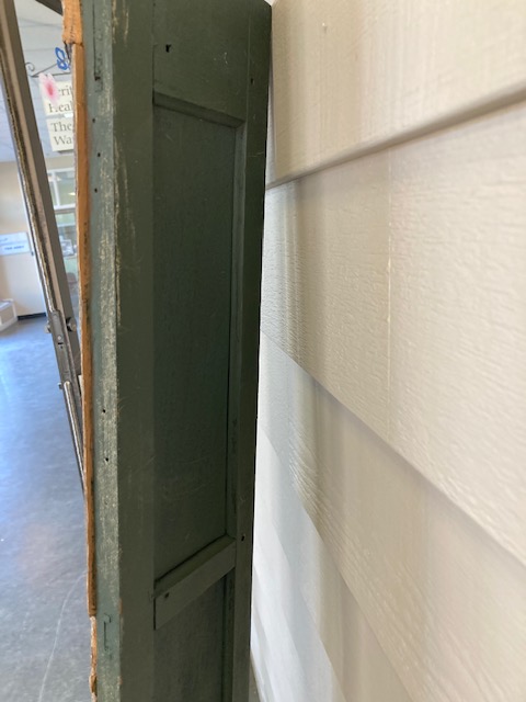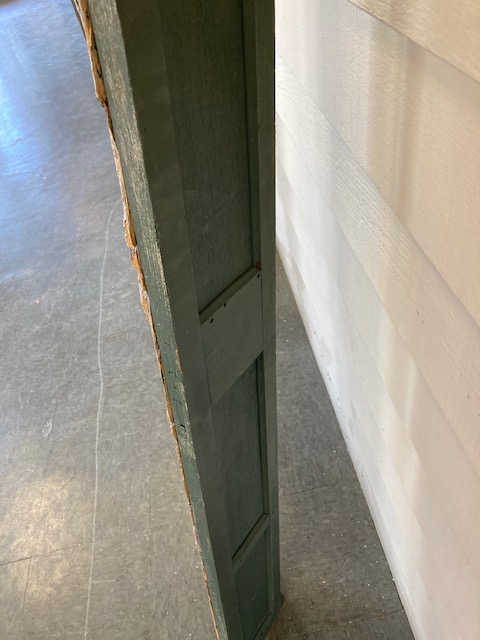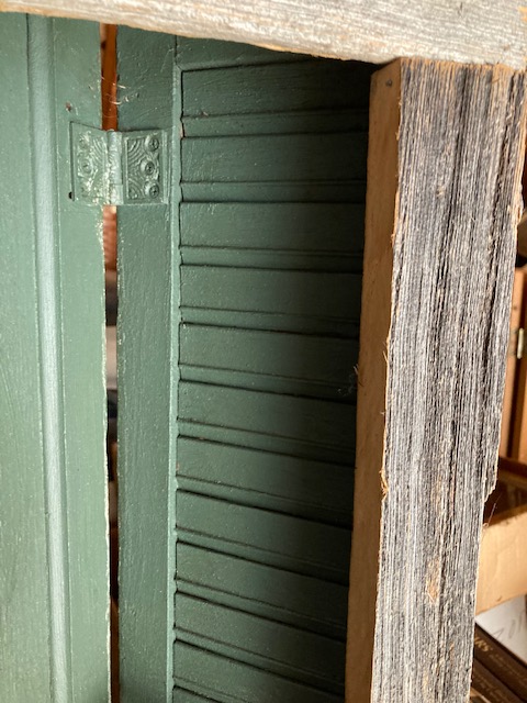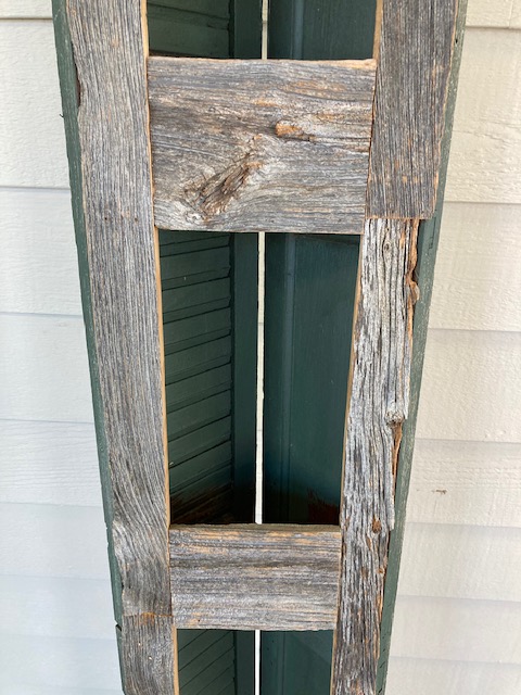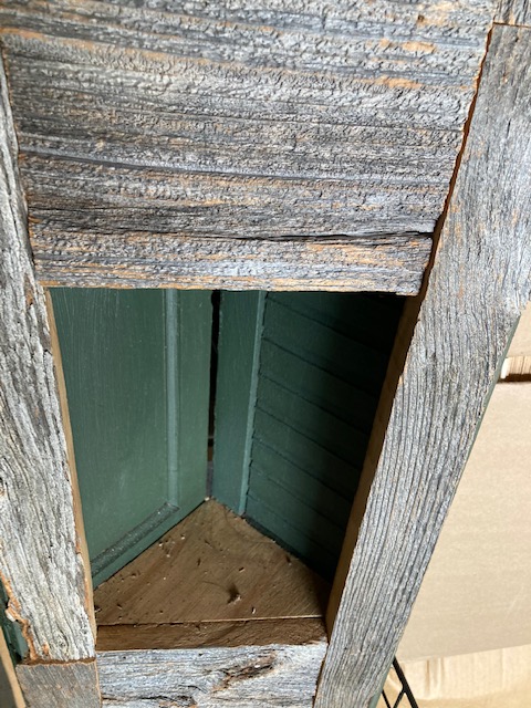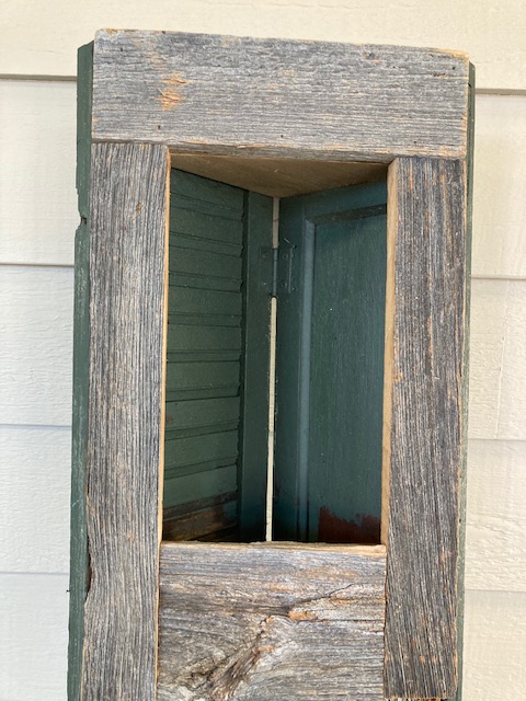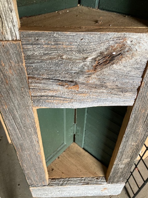 We only have one of these very rustic, primitive corner shelves left. The backs are made of old shutters. The brown/natural one has sold; we still have the one with green shutters as part of the backing.