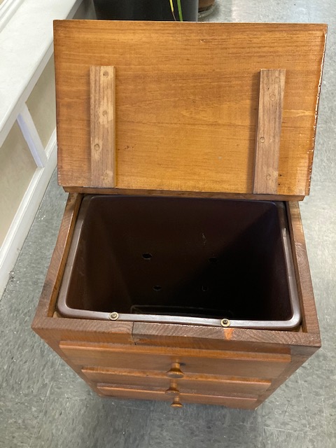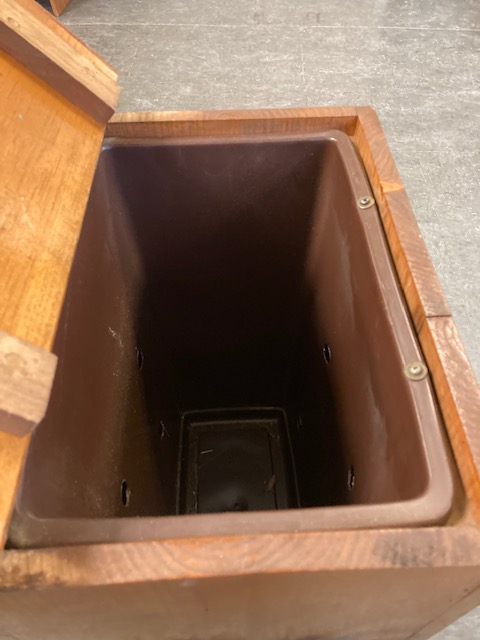 UPDATE! Earlier when I posted this, I got my auctions mixed up. Two days before I purchased this item, which was clearly identified as a trash can, I purchased a not dissimilar item that is a vegetable bin! Whoa… too many auctions, perhaps! (I attended and bid on-line at 8 or 9 that week.)