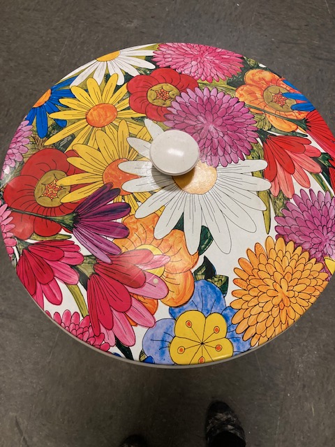 Condition: Structurally, it’s in good solid condition with no dents or holes, and just a tiny amount of rust on the bottom. Visually, it’s great condition. The white is white, the flowers are very bright and colorful, and it’s just an over-all fun and nice looking can with a tight fitting lid. It’s super clean inside.