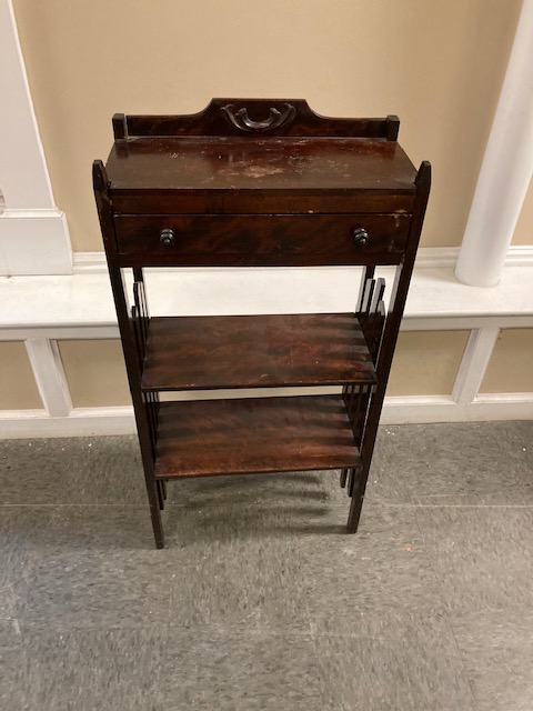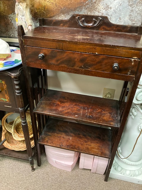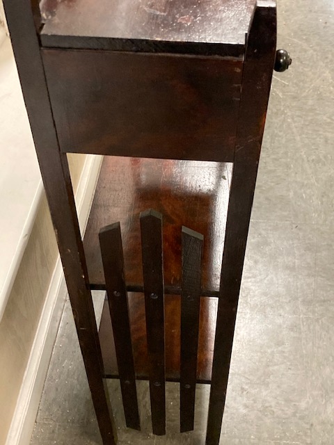 This is a gorgeous piece of antique wood furniture… I just wish I knew what kind of wood it is. If you look closely at the photos, you’ll see the patterns, colors and swirls in the wood that really make this piece stand out. The stand has a number of interested features from the almost mission style sides and front legs that rise above the top surface, to the cut-out back panel that keeps your valuables from falling off.
