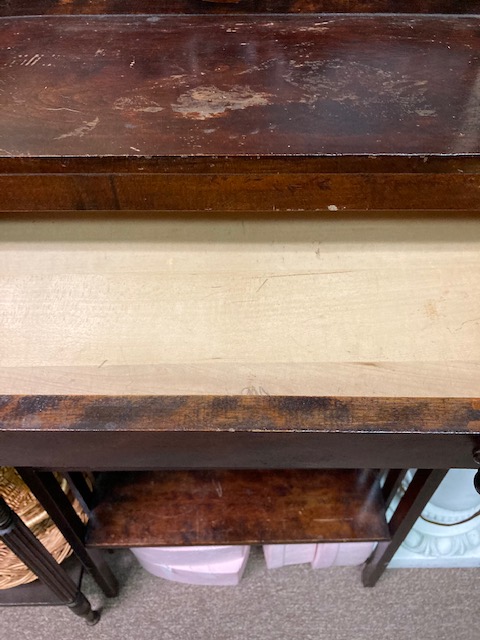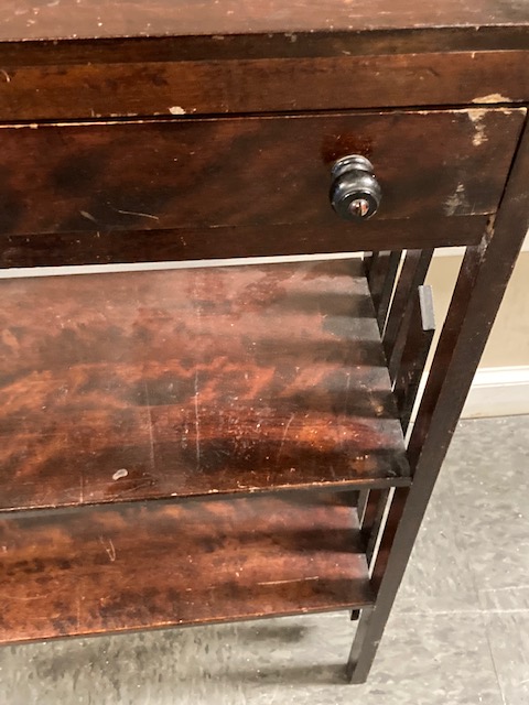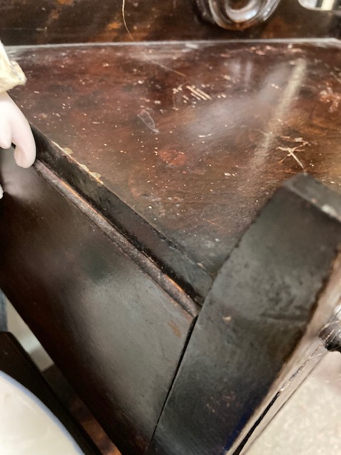 However, like too many antiques, it’s borne some surface damage over the years. I don’t know anything about refinishing furniture, but if done well, when the blemishes on top are cleaned up, you will have a truly beautiful piece, worth passing down through future generations.