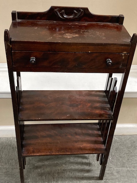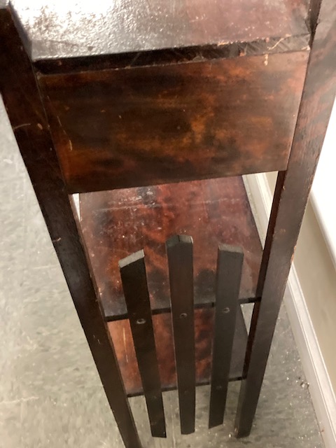 This is a gorgeous piece of antique wood furniture… I just wish I knew what kind of wood it is. If you look closely at the photos, you’ll see the patterns, colors and swirls in the wood that really make this piece stand out. The stand has a number of interested features from the almost mission style sides and front legs that rise above the top surface, to the cut-out back panel that keeps your valuables from falling off.