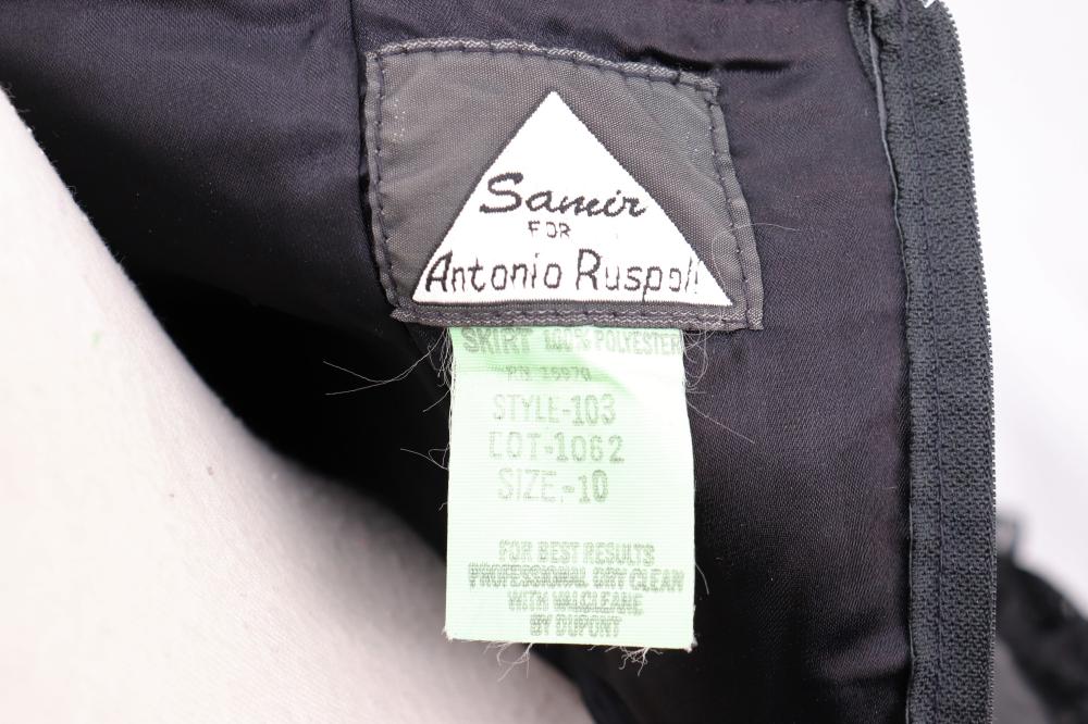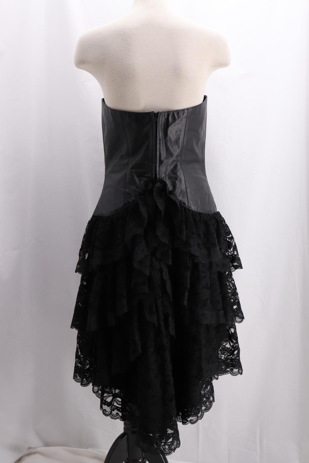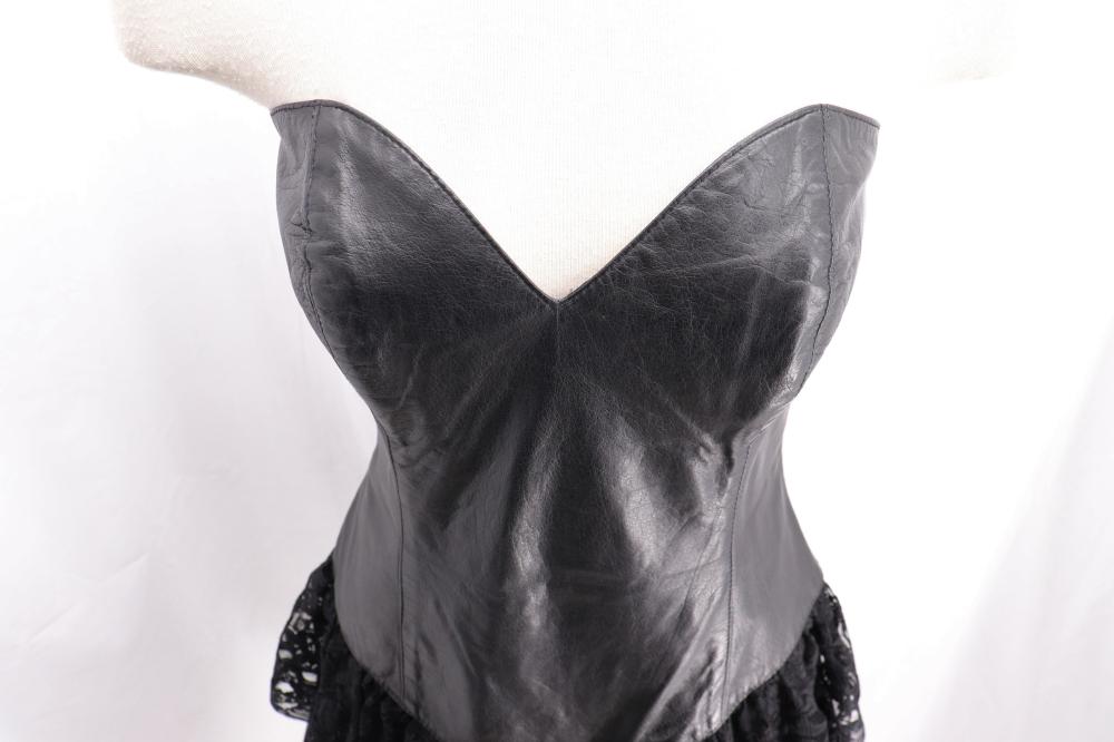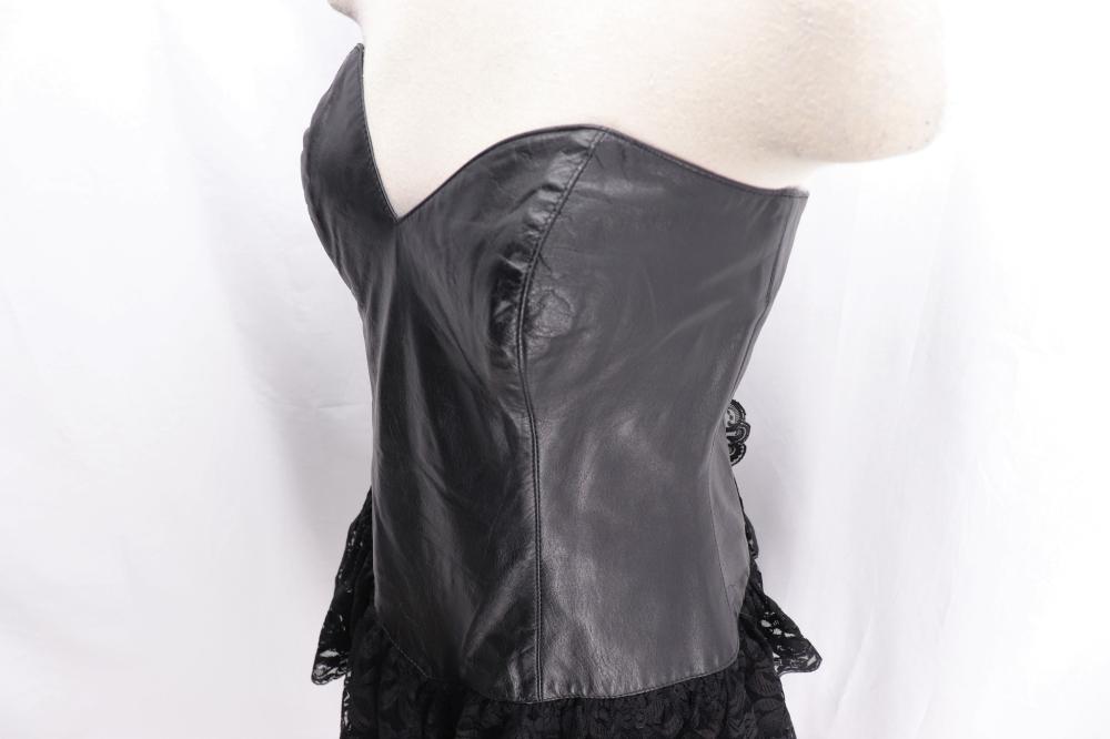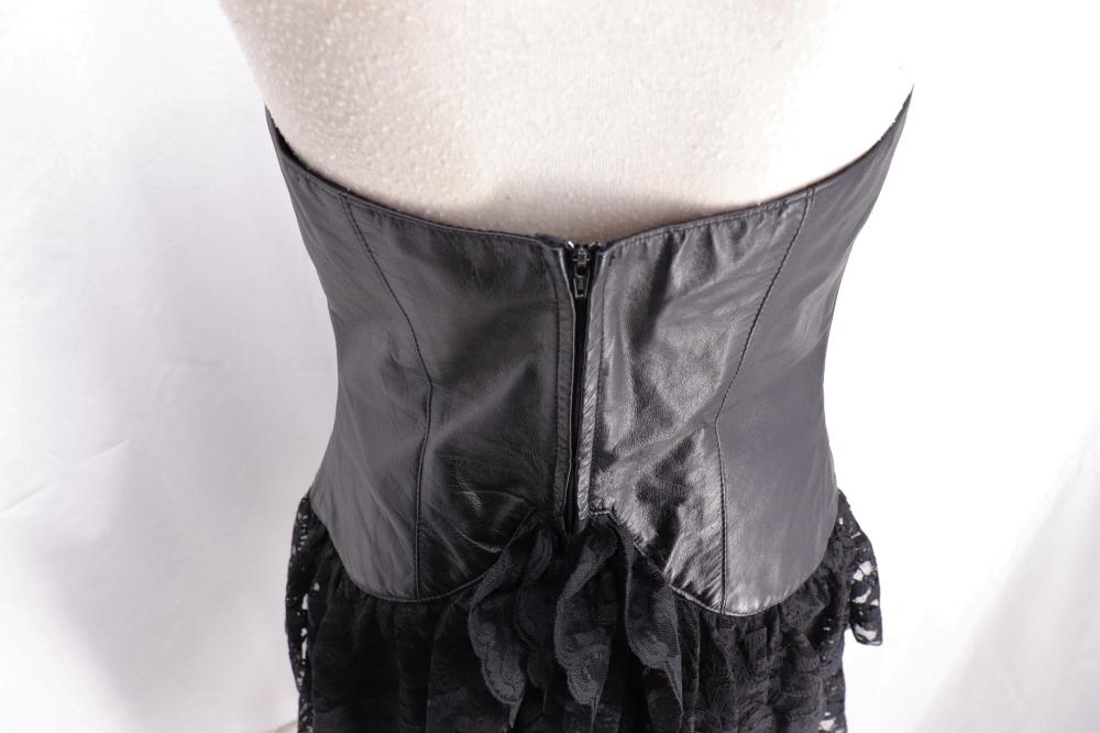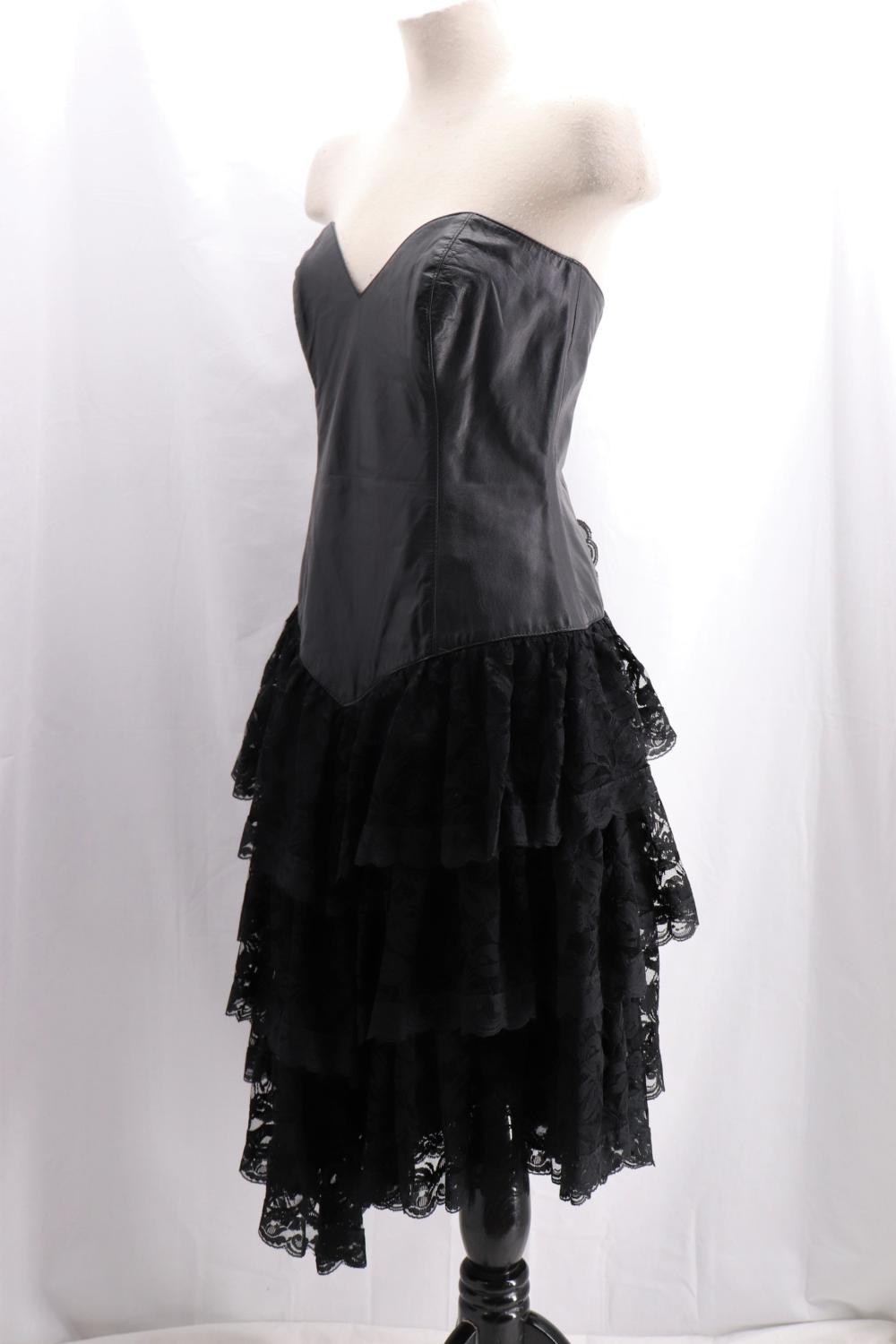This is a vintage 1980’S leather and lace Dress by Samir for Antonio Ruspoli. It has a strapless sweetheart bodice with a layered lace skirt which comes to a point at the center. Original size 10, Approx. 34 bust, 28 waist.