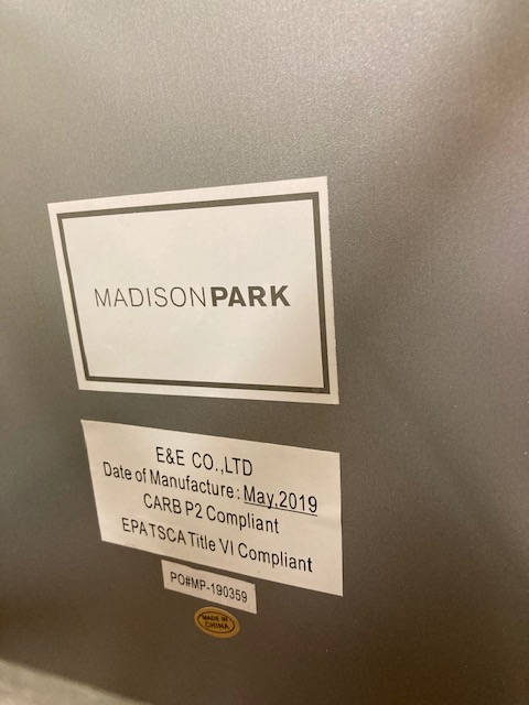 The set is modern with clean lines that balance both angles and circles. Wonderful! (As the photos show, it was hard to get a picture of the top of the stand, as the mirror did too good a job in reflecting the ceiling!)