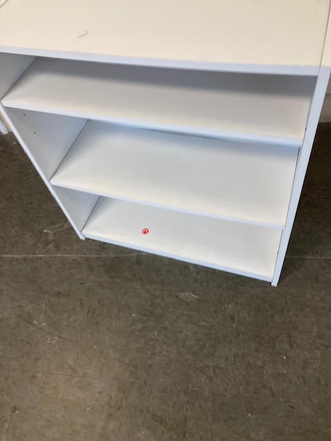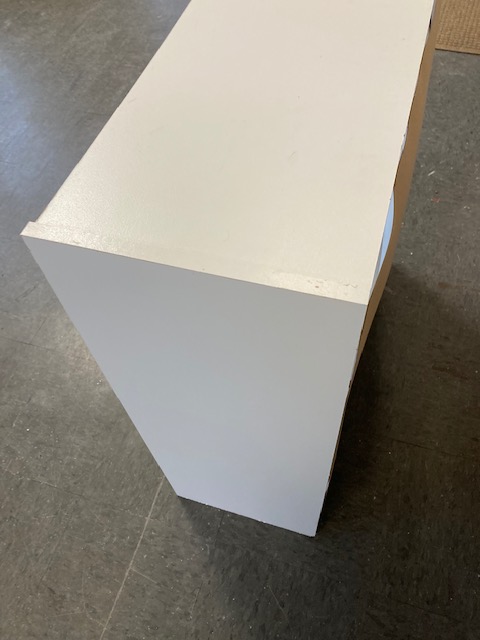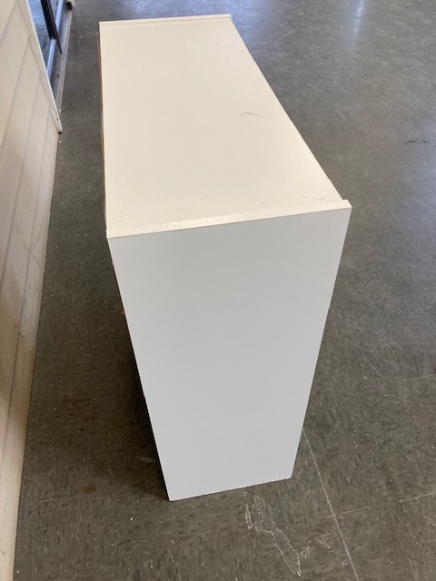 Condition: It’s in good condition, considering it’s not real wood. The person who put it together “missed” when getting the studs in the bottom, so they show (which doesn’t matter as far as looks are concerned, but could mean it won’t last as long as it might otherwise since the pressboard has been eaten up a bit).
