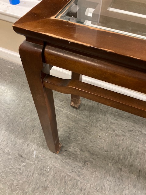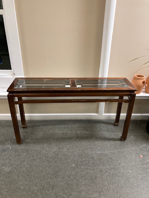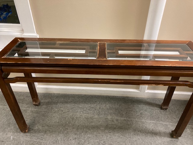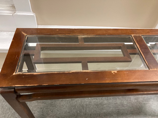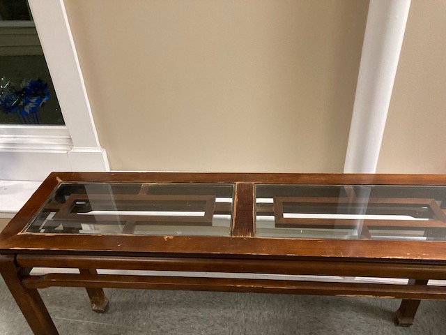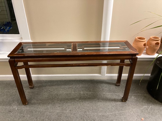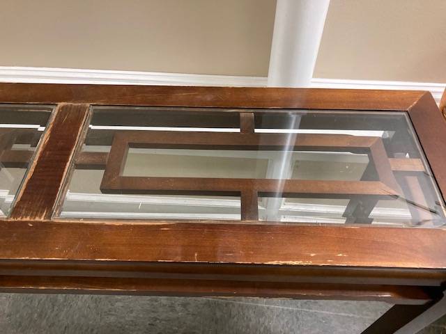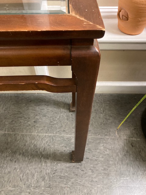 Condition: Structurally, it’s solid. Visually, it looks great until you get up close and can see what may be water damage to the top, under and around where the glass insert is. It seems likely that the table was used to display plants, with the resulting water leaks. There are some other dings and blemishes to the wood as is likely to happen to older furniture.