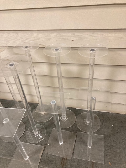 Check out these 8 plexiglass/Lucite pedestals! We have 6 tall rounded ones and 2 that are smaller and square.