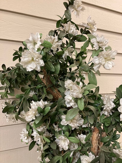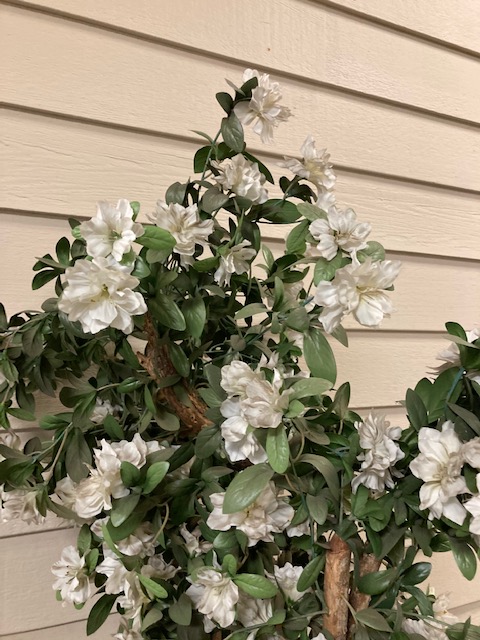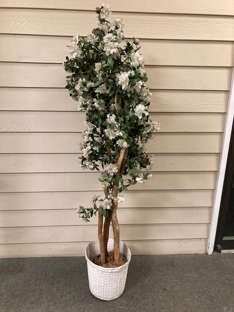 We found this in a florist’s shop in Boston that was closing due to the owners’ retirement. The tree has white flower bouquets, and although some of the flowers have fallen off, there doesn’t appear to be any other damage.
