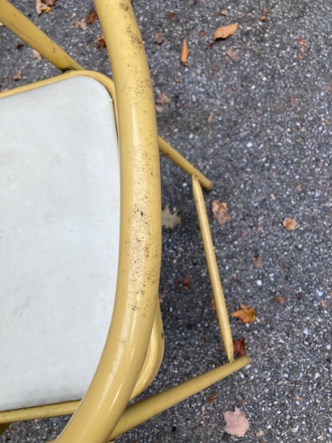 Condition: Very good. The rubber mat is intact with no rips or tears, as is the vinyl cushion. It does have some rust starting on the back of the handle and probably down around the bottom of the legs (this was found in a basement), and it could stand to be cleaned up. (I did some minor scrubbing with window cleaner, but more would be indicated.) All in all, it’s in great shape.