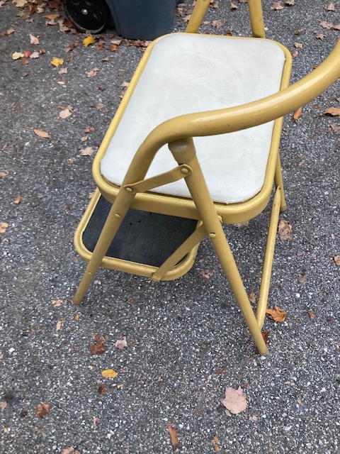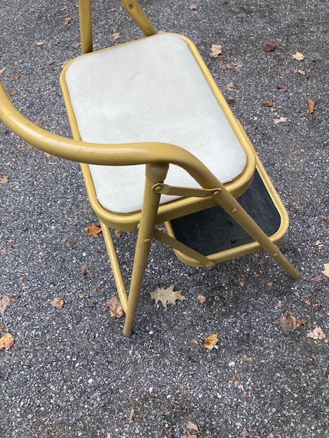 This is the kind of step stool that’s great for the kitchen. There’s one step with a rubber mat to reach into most cupboards , and if absolutely necessary, the seat can be used as a step for those of us who are vertically challenged. Otherwise, the stool is great in the kitchen for hanging out while mom (dad, spouse or whomever) is cooking… the vinyl seat is much more comfy than those stools with a second rubber mat instead!