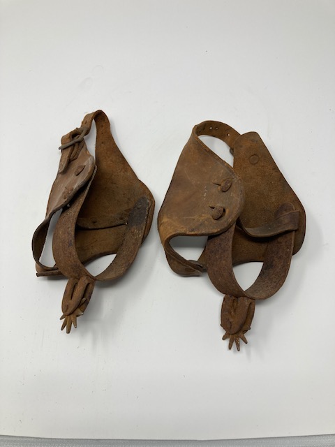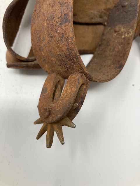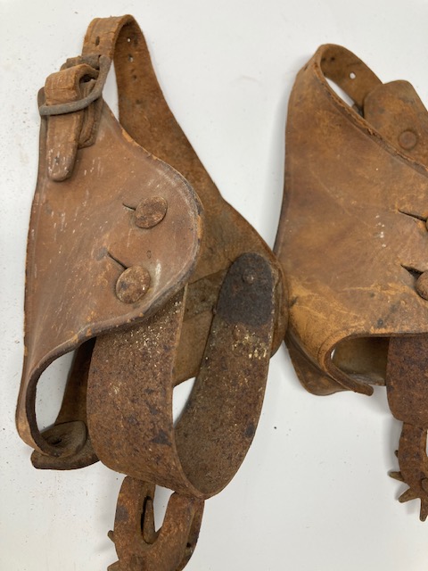 Condition: Metal spurs are rusty. Leather is stiff, not supple. However, it seems all the pieces are there, and it wouldn’t take much to work that leather again!