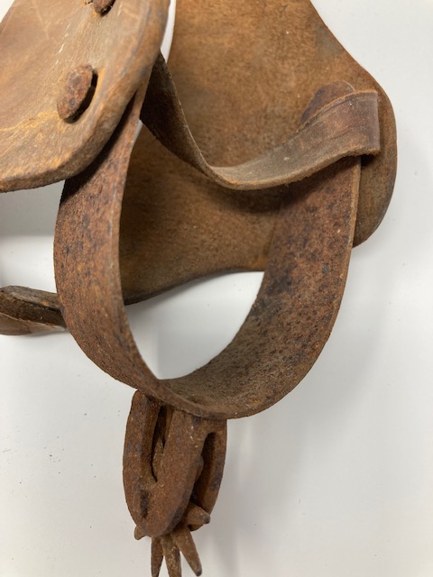Condition: Metal spurs are rusty. Leather is stiff, not supple. However, it seems all the pieces are there, and it wouldn’t take much to work that leather again!