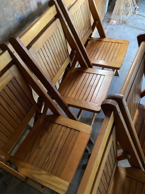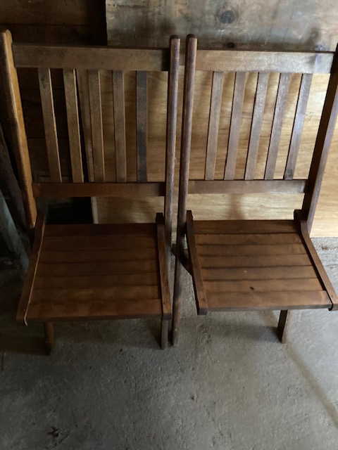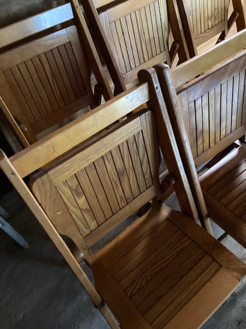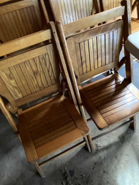 This is a nice lot of 8 vintage folding wood chairs. Five are identical and apparently came out of a now defunct organization. Two of the remaining chairs are the same, with the final one different from all the rest.