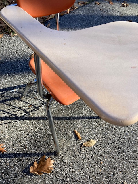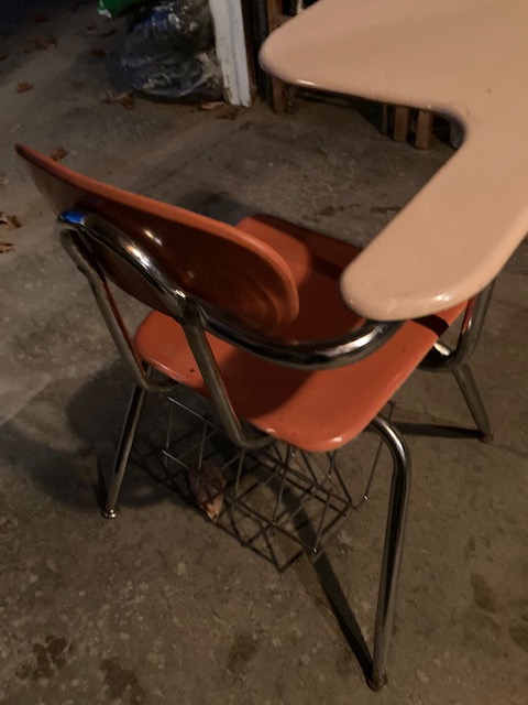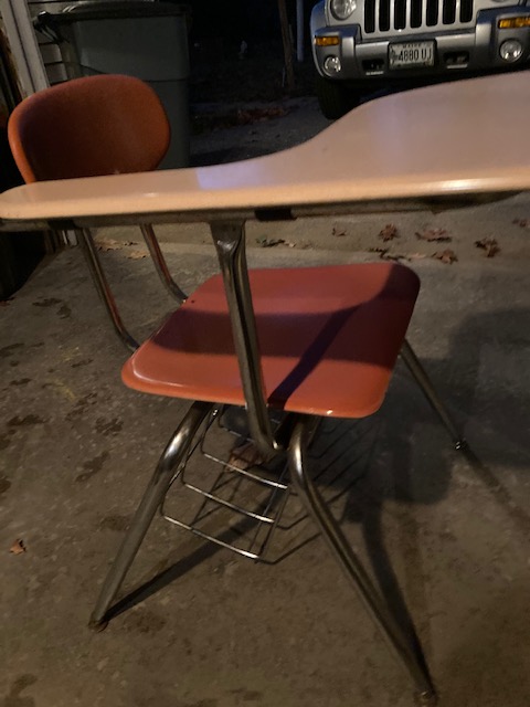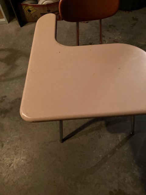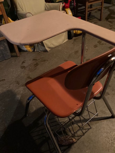 I found this desk way in the back of my garage; I’d long forgotten it was there! It’s a one piece deal that doesn’t have a drawer but is in really good shape. It’s probably meant for kids who are about 5-12 years old? (My grandson is 4 and small for his age, so I’m having a hard time judging.)