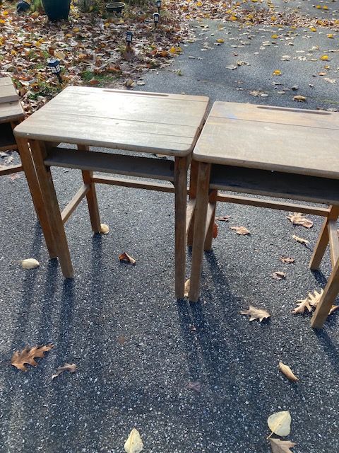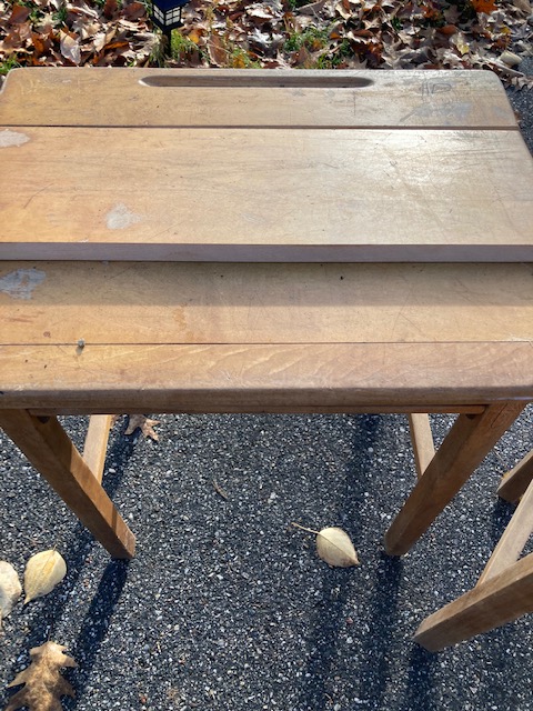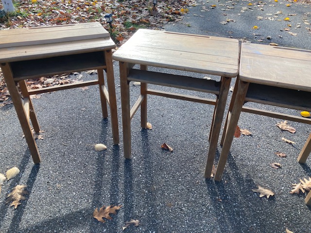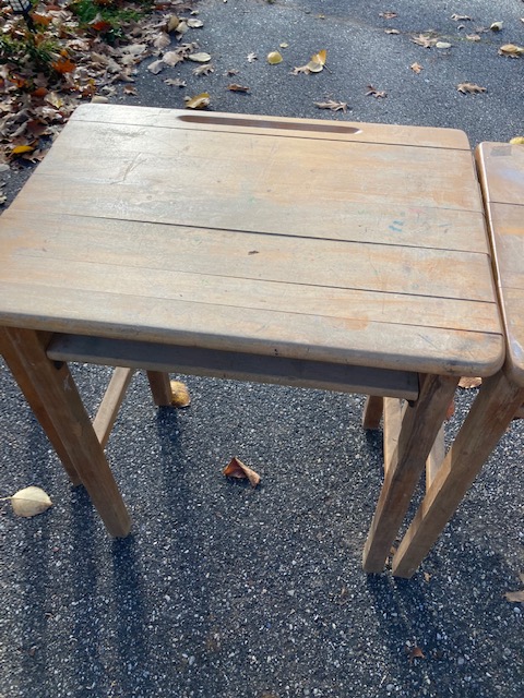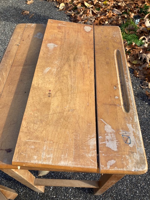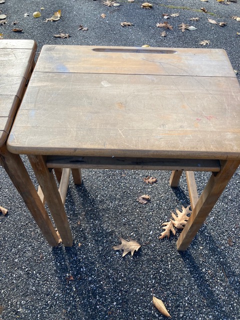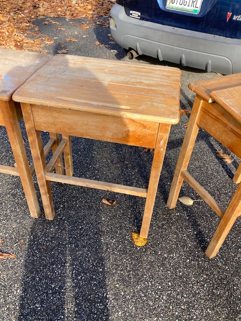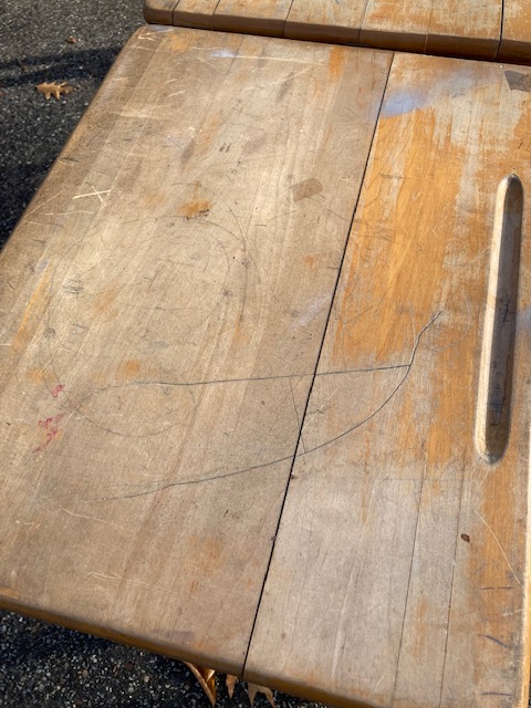I forget where these three desks came from. After picking them up at a yard sale about a decade ago, they got buried in my garage and I just now dug them out. But it was a local parochial school, I believe.
