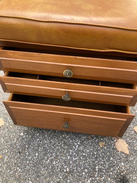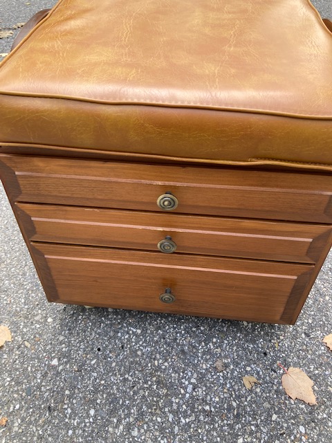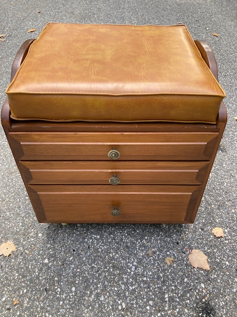 This combination sewing stool/cabinet on casters with three drawers and a removable cushion is absolutely fabulous.