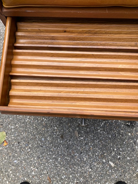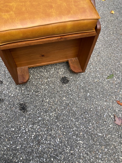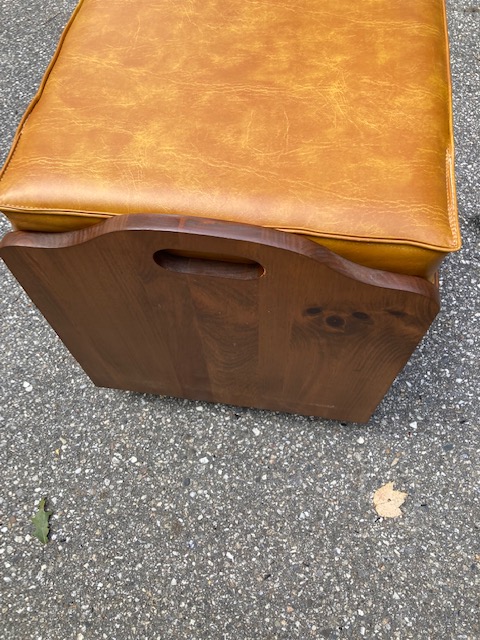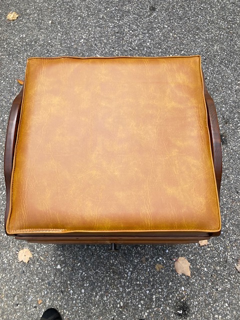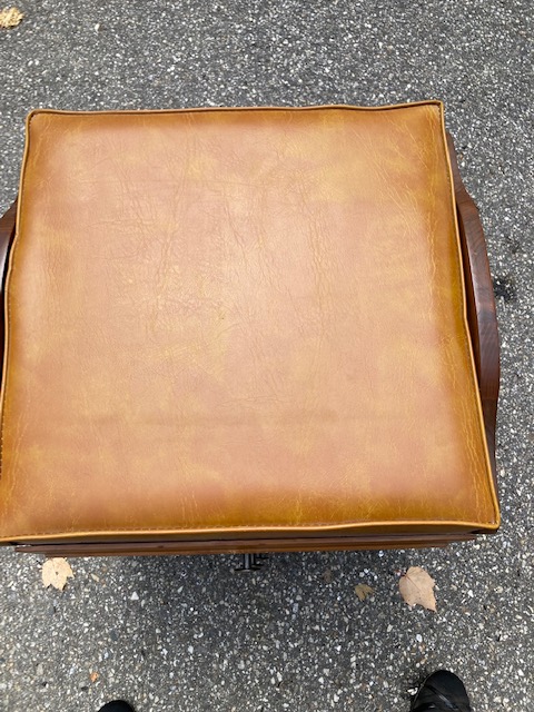 Condition: Excellent. An absolutely beautiful piece. The cushion has no cracks, rips or tears. The wood is in near perfect shape with few marks or blemishes. The castors roll as they should.