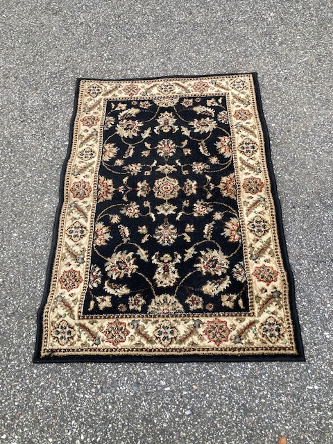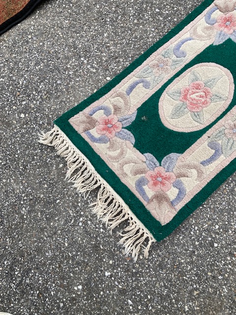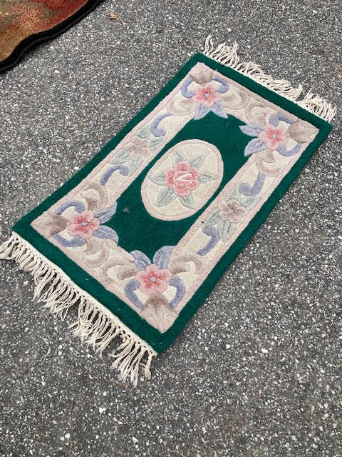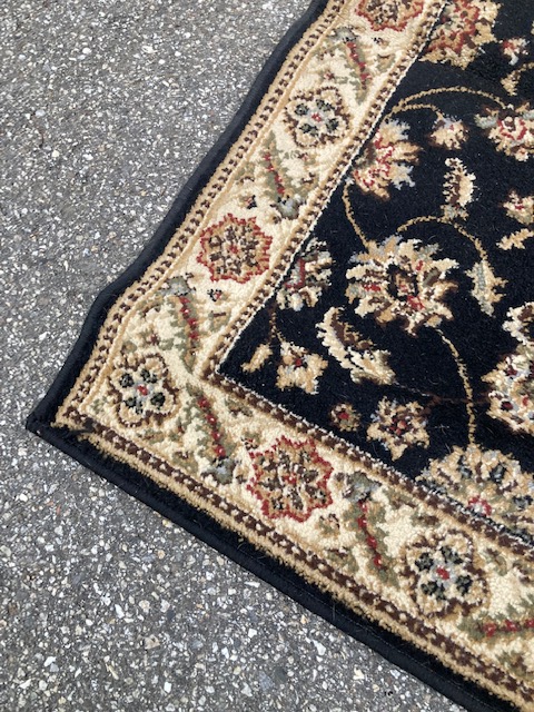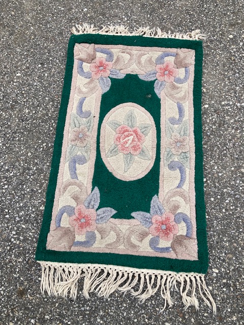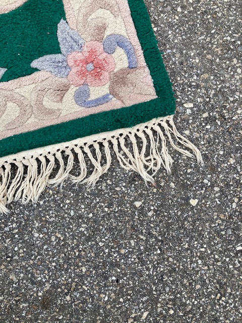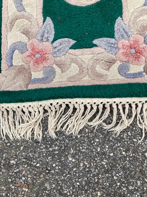 This is a nice little green and black carpet in good condition. There are no rips, tears or frays noted; the fringe is intact.