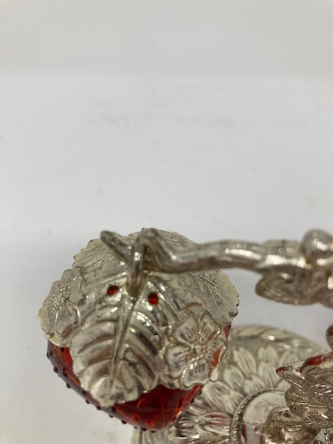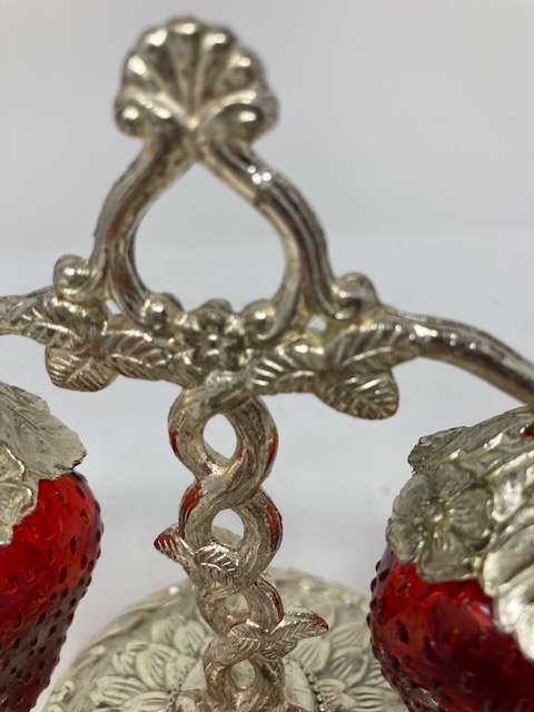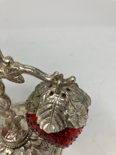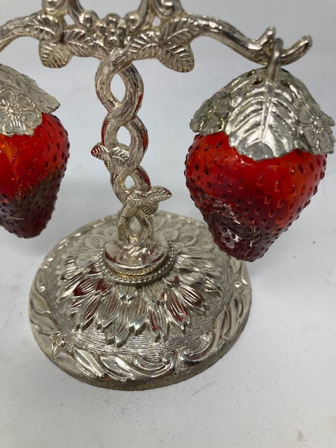 Dimensions: The strawberries are each about 3″ long including their caps. The piece is about 5 1/2″ high, and 5″ wide overall. The base is about 3 1/2″ in diameter.