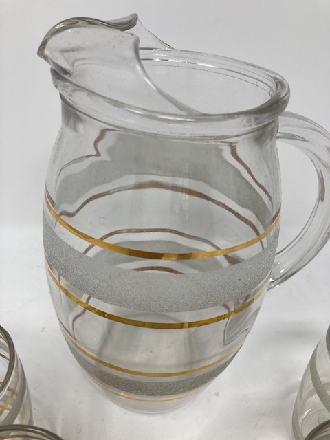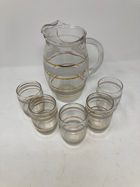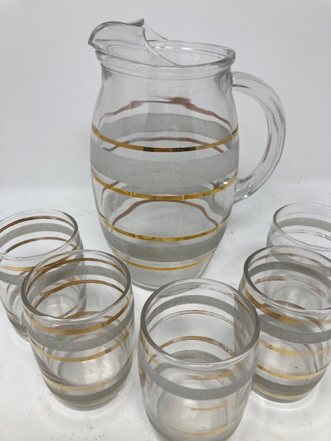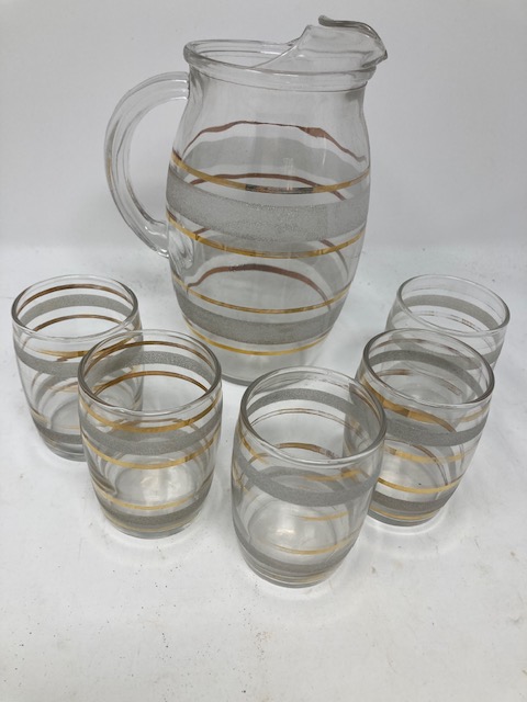 This is an adorable little set that appears to have been well-loved. The stripes on the glassware are “frosted” with signs of wear on some of the glasses. (In some areas, the stripe has almost completely worn off.)