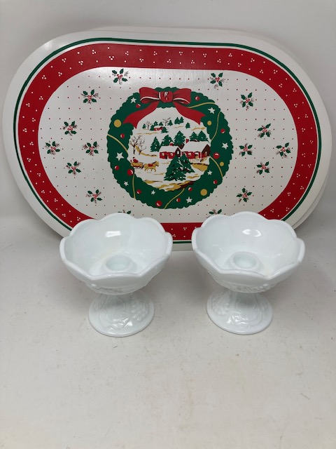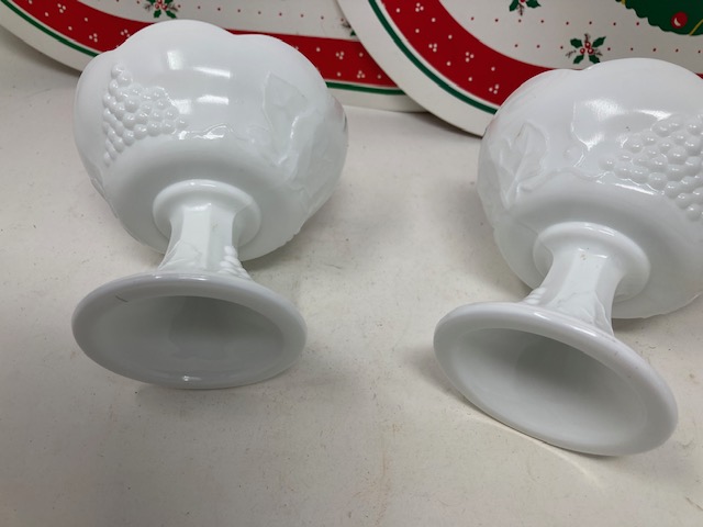 The two milk glass candle holders are very nice. The plastic Christmas placemats are in good shape.