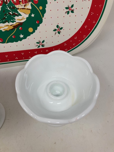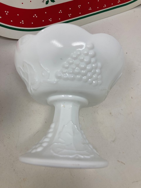The two milk glass candle holders are very nice. The plastic Christmas placemats are in good shape.
