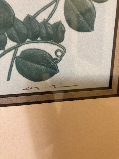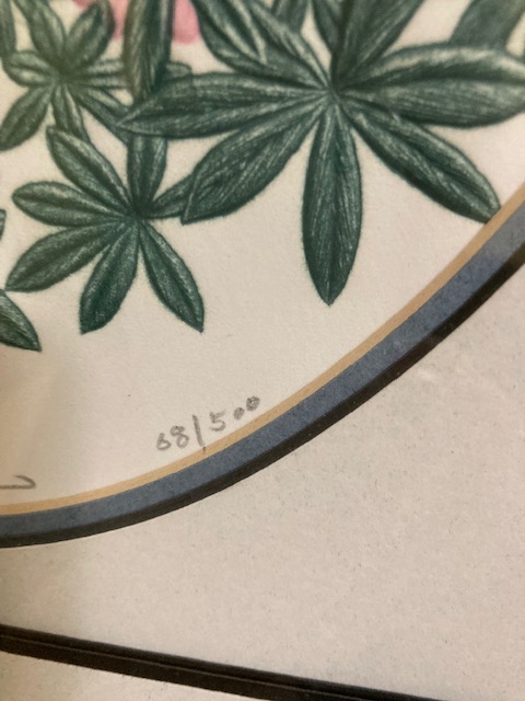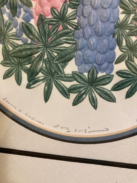 The loon print is numbered 68/500, and is titled “Loons and Lupines”. I can’t read the artist’s signature.