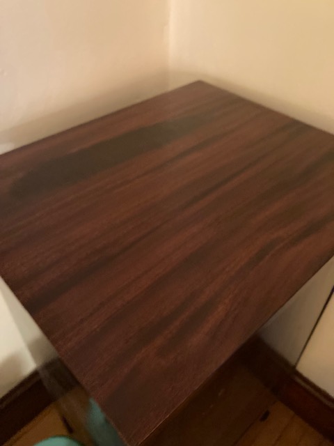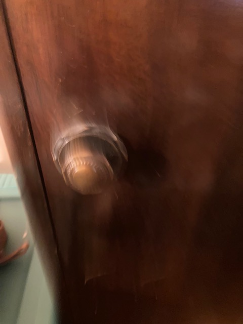 This is a lovely piece that’s good and solid with no exterior blemishes or flaws. However, the inside of the cabinet could use some work. It seems someone decided to move the shelving around, and at least one is now missing.