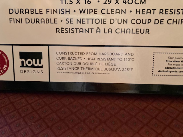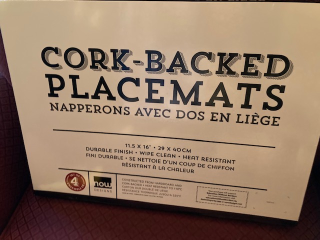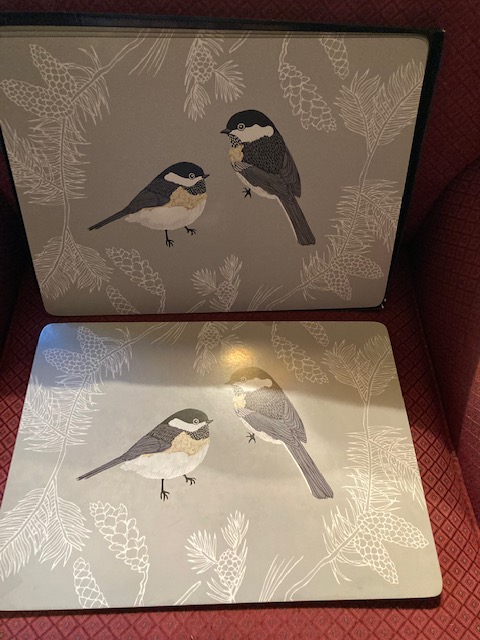 My photos do not do these placemats justice. They are in perfect condition, and the chickadees’ colors beautifully contrast with the white outlines of the pine cones surrounding them.
