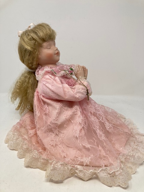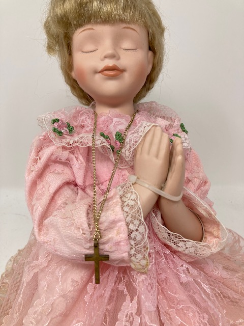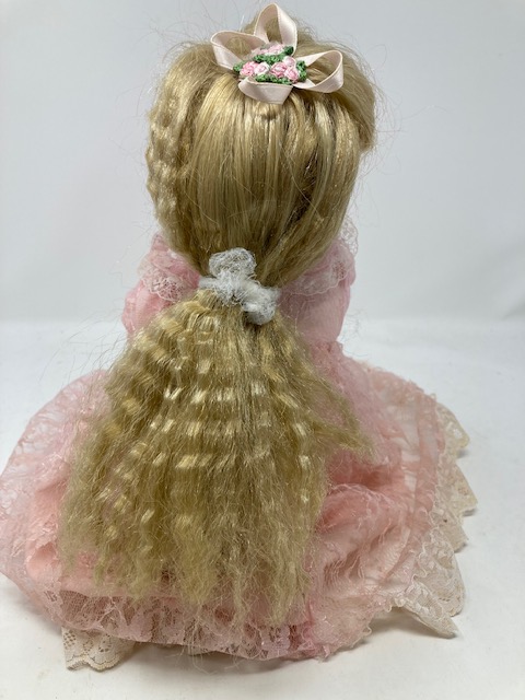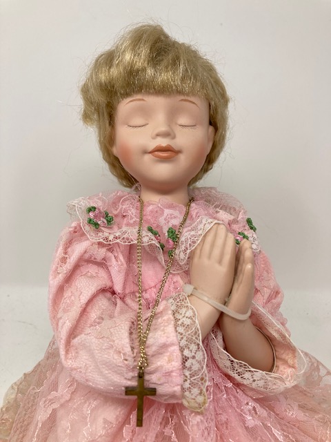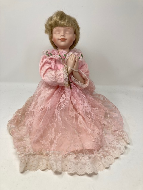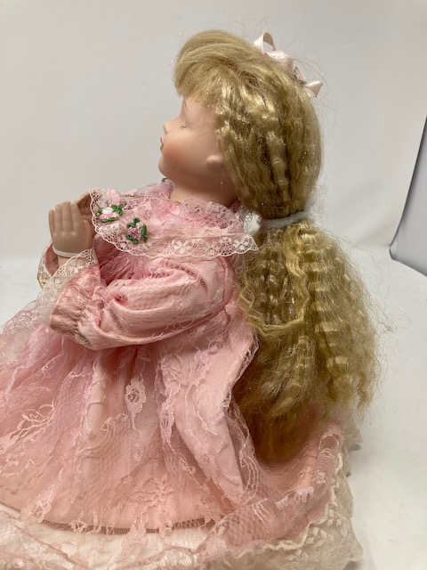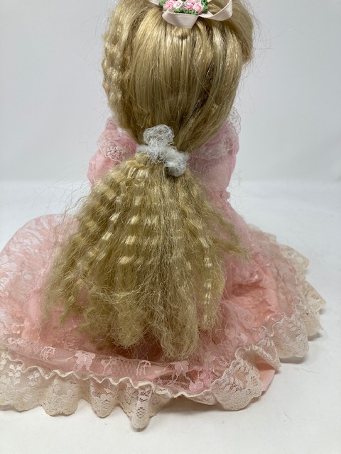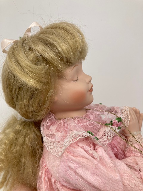 This is a lovely, vintage doll with loads of blonde hair and a beautiful pink lace dress. She seems so calm and peaceful…