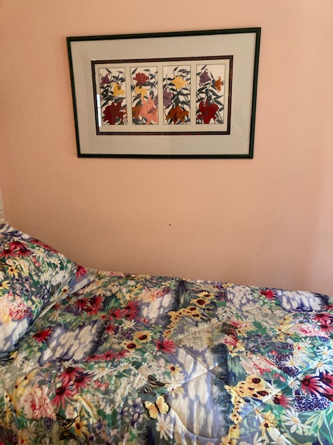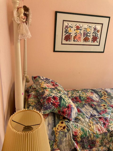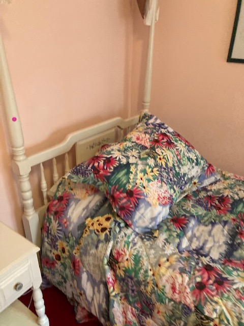 The comforter has a stain on the reverse that looks like coffee (?); it doesn’t show on top and may wash out. The sheets and pillowcase is a white & purple hydrangea pattern.