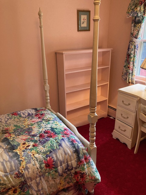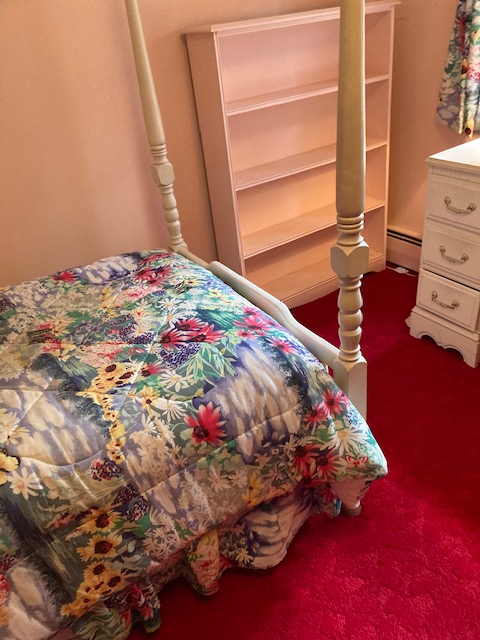 … a 4 poster twin sized bed with mattress (inc foam for comfort, mattress cover and plastic cover) and bedding (two pillows, comforter, etc) ($125)