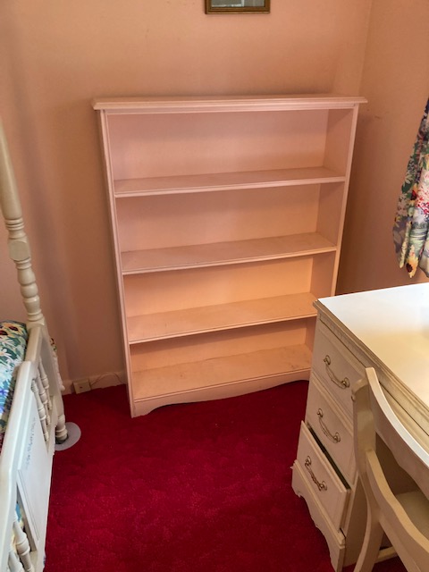 The pale pink bookcase is 48 1.2″ high, with five shelve. The top shelf has a lip, and is 37 1/2″ and 8 1/2 inches deep. This bookcase is real wood.