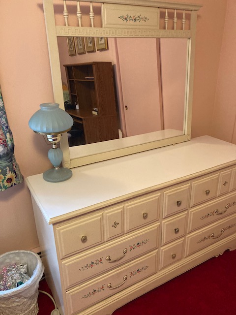 The large 9 drawer dresser is 55″ wide x 17 1/2″ deep by 30″ high. The mirror is about 39″ wide x 35” high. The pale blue hurricane type lamp 16″ high by about 6 1/4″ in diameter.