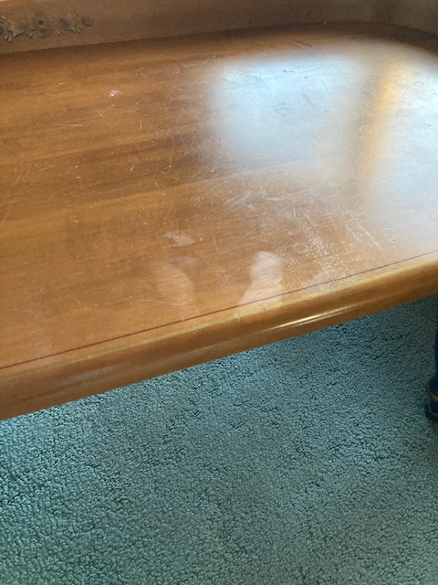 Condition: Other than the legs showing signs of some chipping paint, the set is in near perfect condition. It does look like the coffee table sustained some water stains, as the photos show.