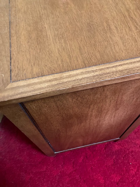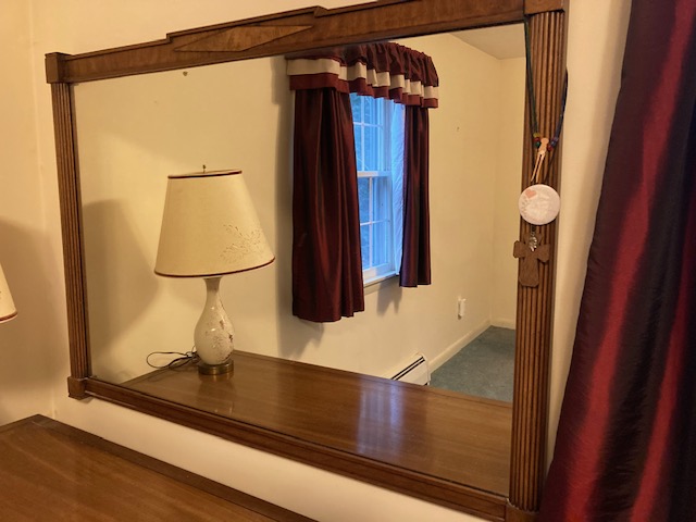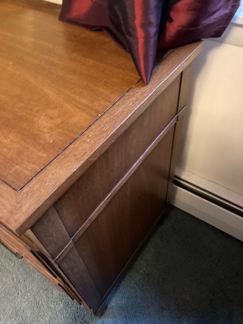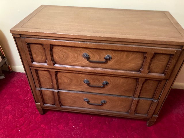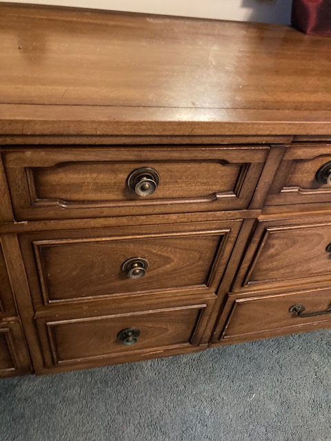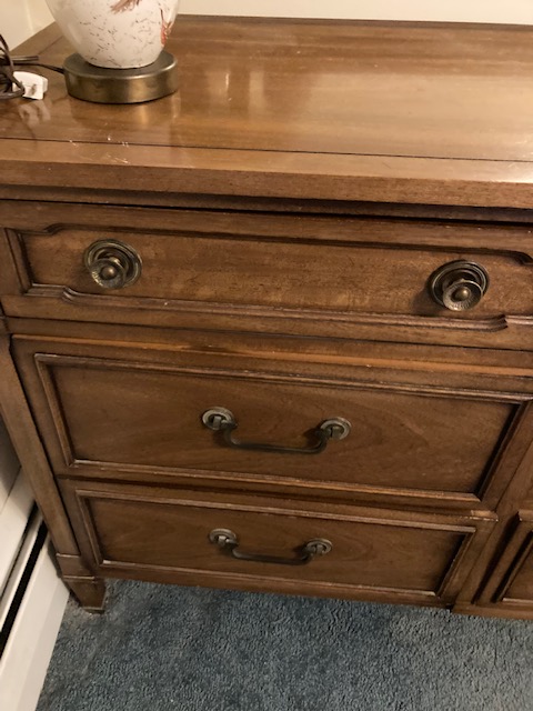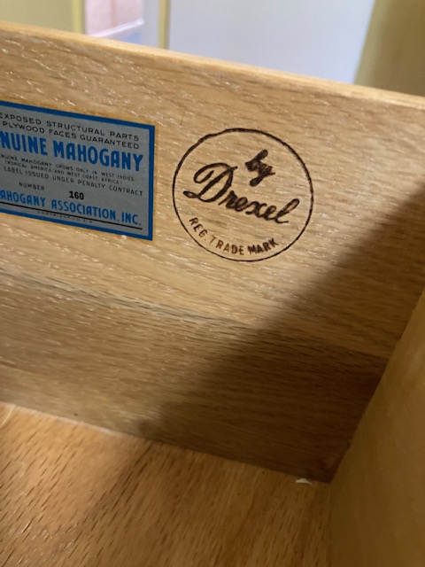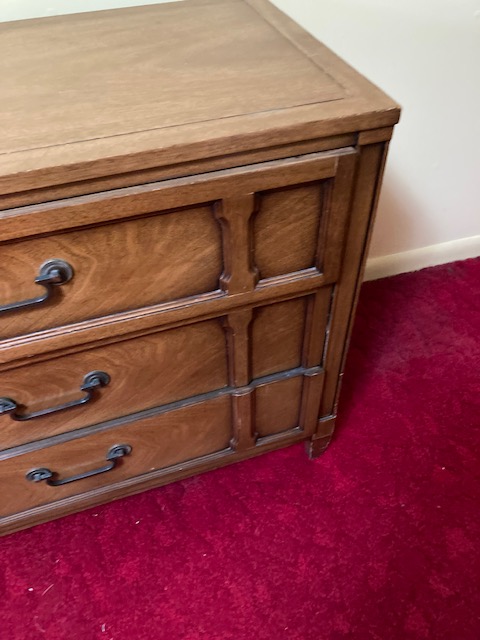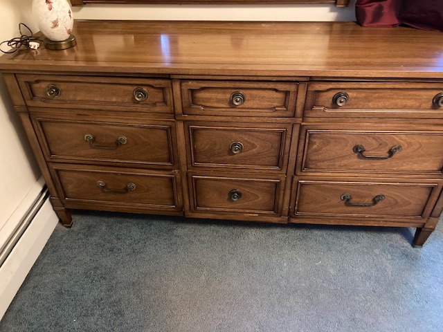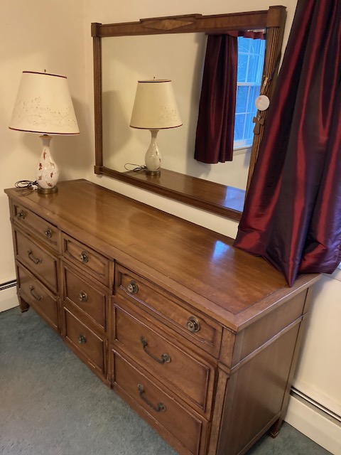 The set is in marvelous condition. The vintage triple Drexel dresser is solid and lovely; the mirror – which doesn’t seem to match as it has a Frank Lloyd Wright feel to it – is a great accompaniment.