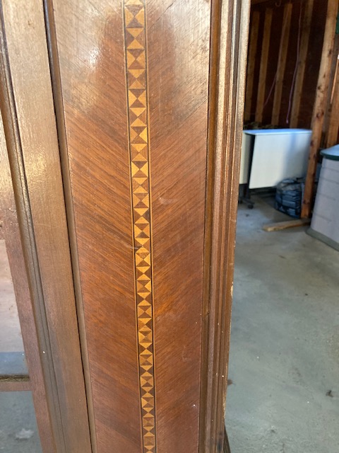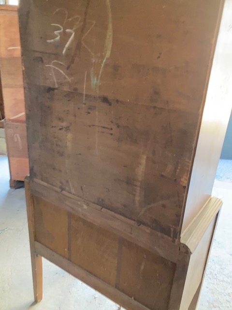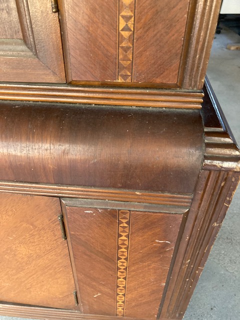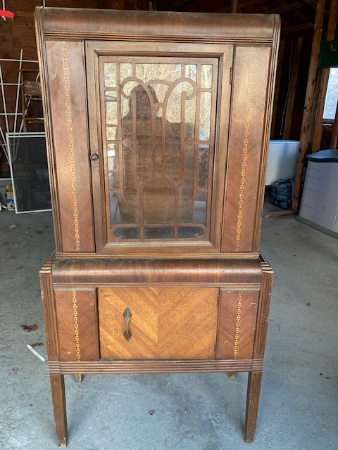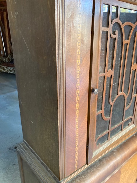Condition: Very good. The veneer is in good shape, and the wooden detailing over the windows is surprisingly undamaged. The piece definitely needs to be cleaned up and polished a bit but once that’s done, you will have a wonderful old hutch.