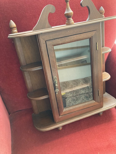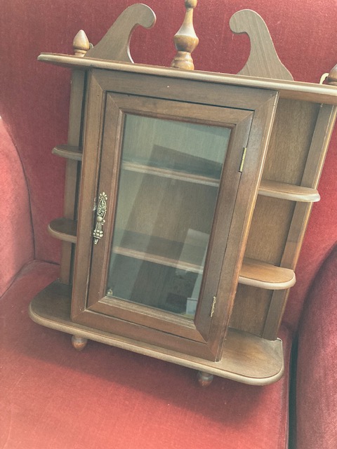 This is a nice, probably vintage (i.e. more than 25 years old) curio cabinet designed to hang on the wall. It has two interior shelves (3 levels in all) with a surface to display items on top as well as on the left and right shelves.