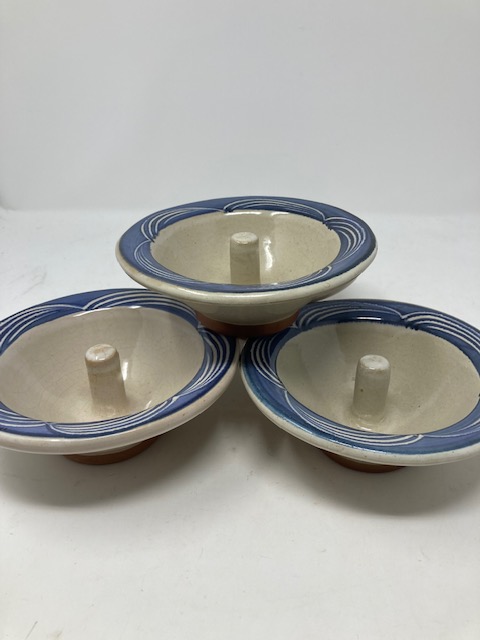 Dimensions: about 6 1/4 inches in diameter and 2 inches high, although they are slightly different in sizes because they are handmade