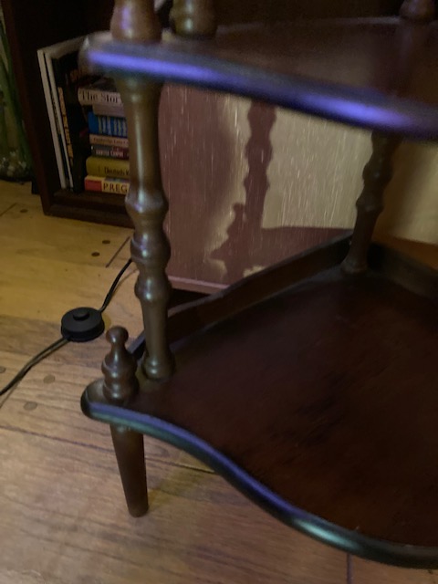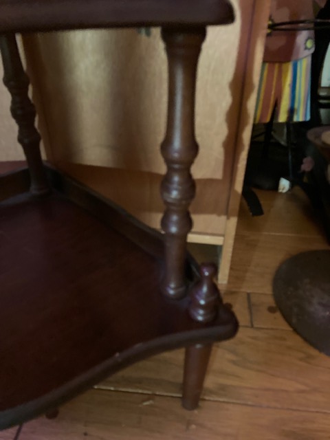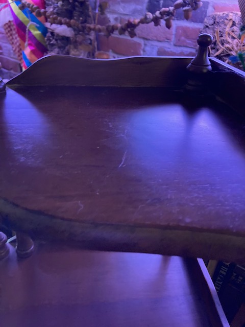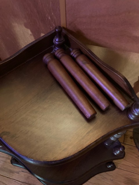 Condition: Aesthetically it’s lovely with very few scratches or blemishes. But the two front legs don’t stay on well; the finials screw in, and as long as the shelf isn’t moved, they hold firmly in place.