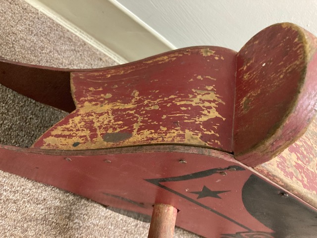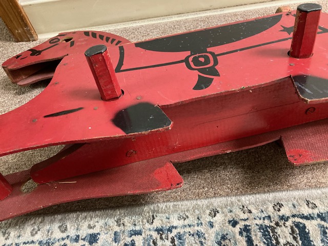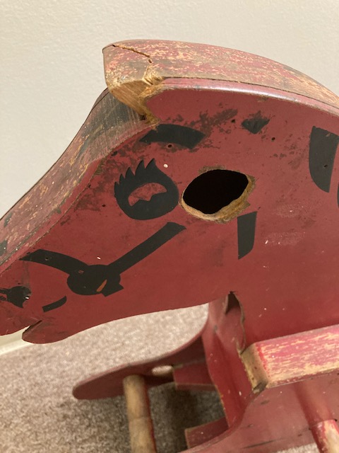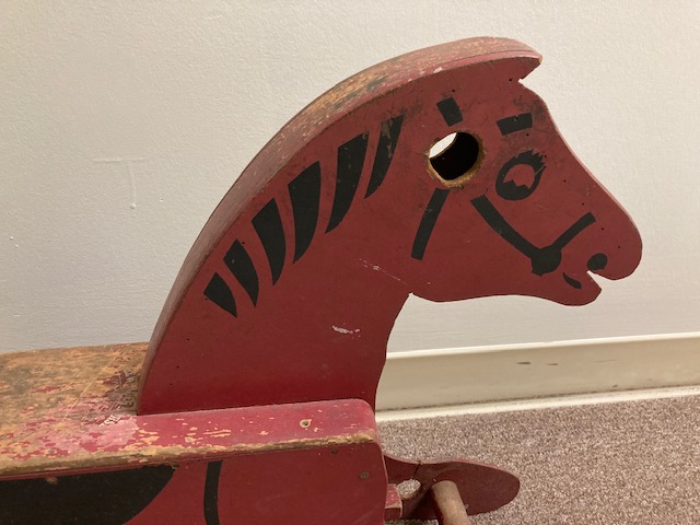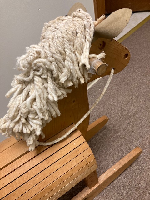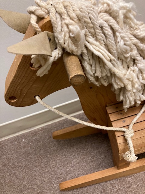 This neutral colored rocking horse with the yarn mane is perhaps from the 1970s (?). That still makes him vintage, or even close to antique, the way some people define antiques.