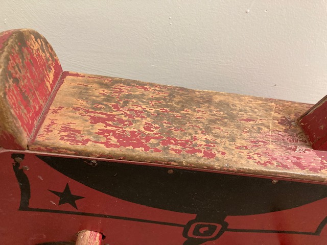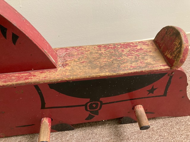 Dimensions: Vintage rocking horse: 26″ L x 7.5″ W. It’s 14″ to the top of the seat, and 22″ to the top of the horse’s head.