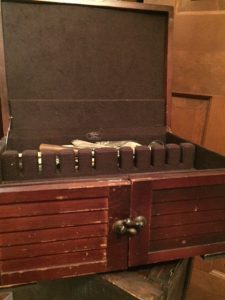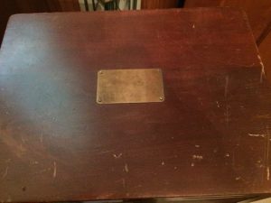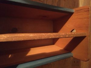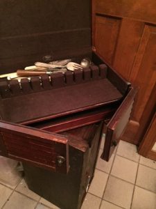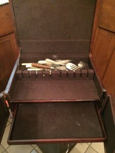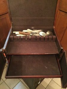 This vintage silverware chest was probably considered fairly high end at one time… maybe 100 years ago. Heavy and solidly made, it’s still a nice piece even with its age showing.
